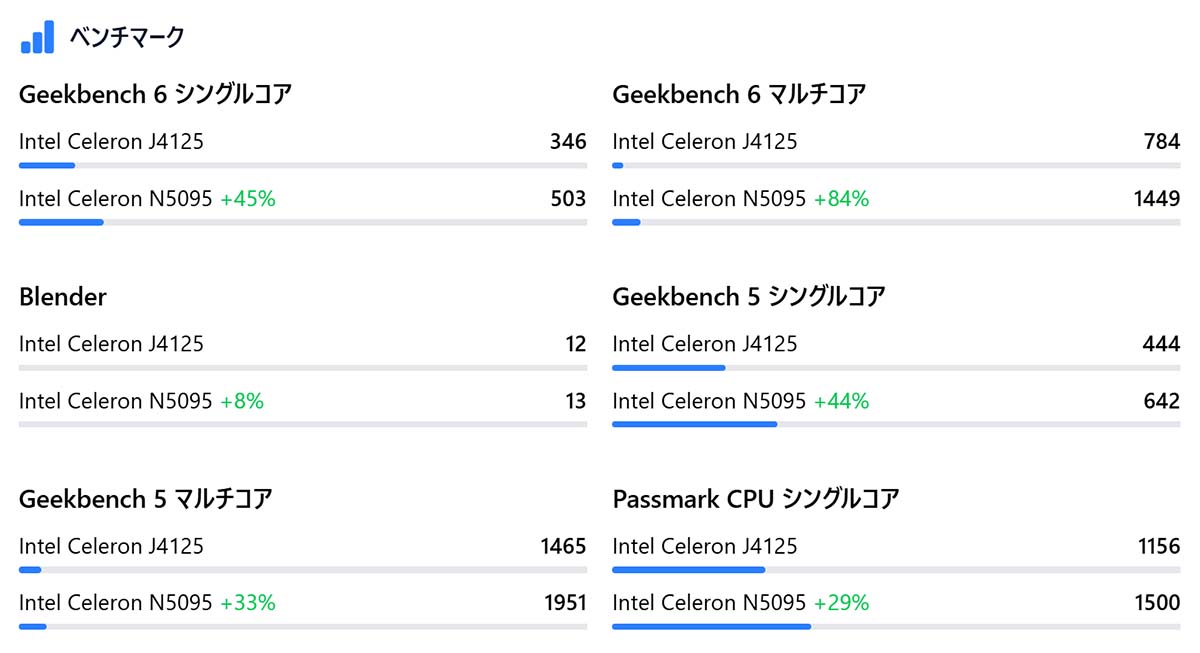 性能の違いといっても当然ながらN5095のほうが性能が高いのは当たり前でJ4125に比べてどれだけ速いのか?消費電力がどれほど違うのかという2点が重要です。