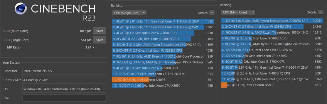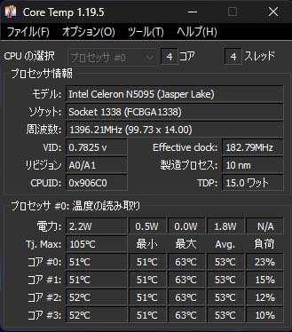 この結果を見る限りはN5095のほうがJ4125に比べて3割ほど早いようです。そして消費電力に関してですがJ4125のTDPが10Wに対してN5095が15Wなので消費電力もN5095のほうが3割ほど高いという結果になります。そういった意味ではN5095になったからといっても買い換えるだけの理由には欠けると思います。ただ電源供給が昔に比べてUSB PDにより15Wどころか65Wでもモバイルバッテリーから給電でき安定動作することを考えると消費電力の多さに関してはデメリットになりにくいとは思います。