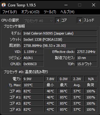 CINEBENCHを動作中の温度です。しばらく見ていましたが85℃前後で推移していました