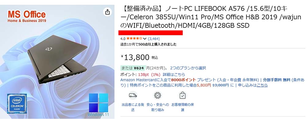 これは現時点でAmazonで販売されている中古ノートPCです。価格も15,000円以下でOfficeソフトもついていてかなりお得に感じますがCeleron 3855Uは第6世代のCPUなのでWindows11には非対応です。しかし非公式な方法でWindows11にアップグレードしています。良心的な価格ではありますがメジャーアップデートできないことを一切記載せずに売っています。実際非公式PCで13,800円でも正式対応のPCが19,500円で売られていればそちらを買おうと思うかもしれません。ただ表示をしていないのは悪質です。