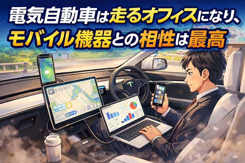 電気自動車は走るオフィスになり、モバイル機器との相性は最高だと思っています。EVは大型のガジェット機器なのかも